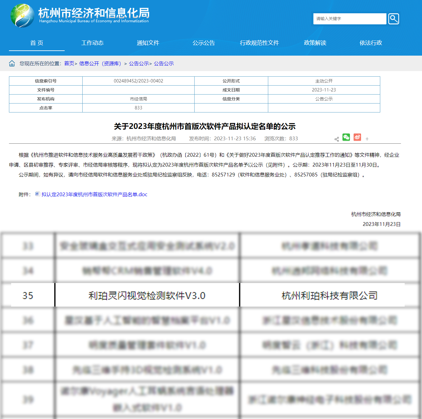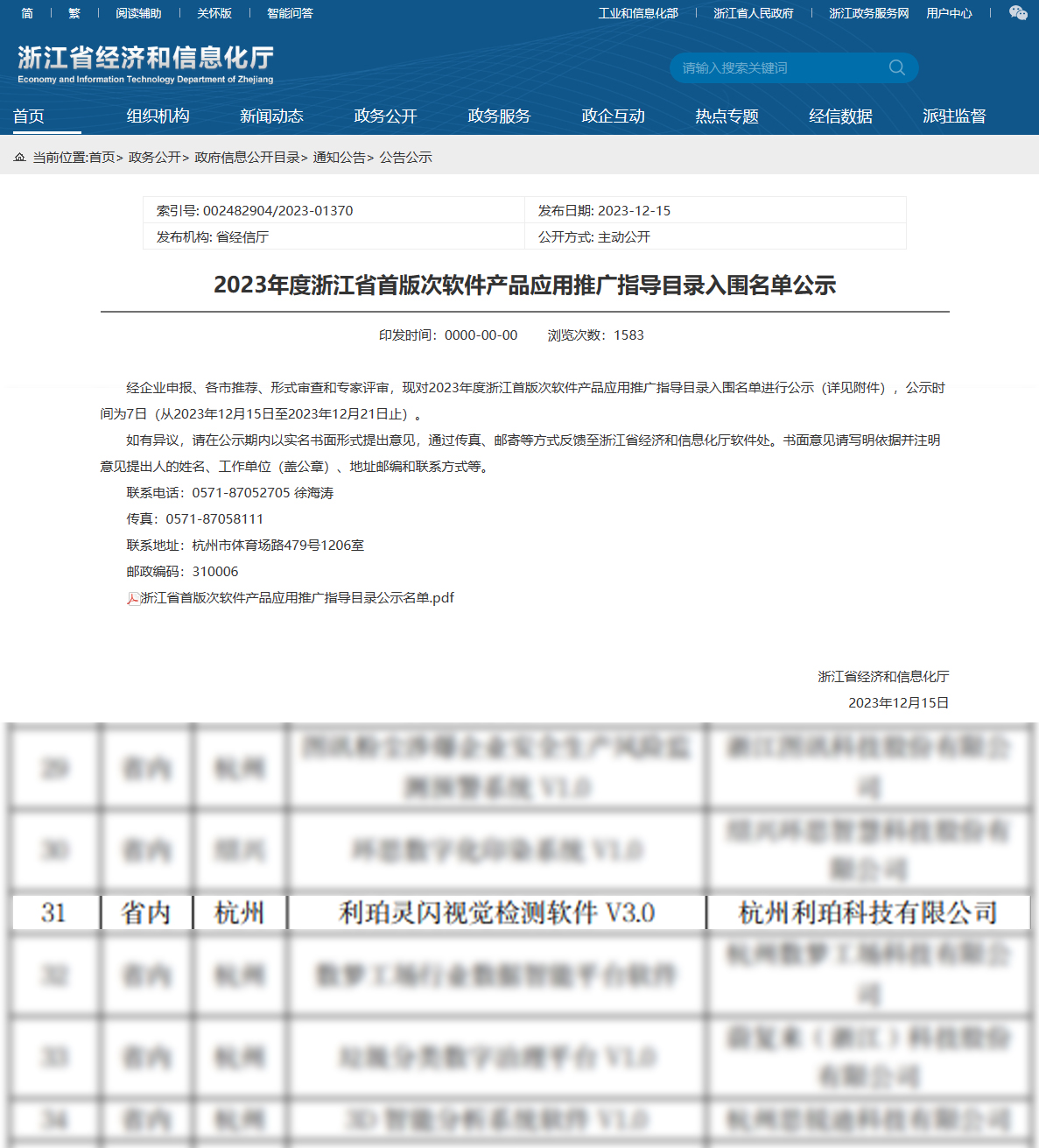 12月22日,經企業(yè)申報、各市推薦、形式審查和專家評審,杭州利珀科技有限公司“利珀靈閃視覺檢測軟件V3.0”成功入選2023年度浙江省和杭州市首版次軟件產品認定名單。此次入選,標志著利珀在軟件領域的再一次突破,技術優(yōu)勢以及研發(fā)成果獲得了省、市級專家的高度認可。
