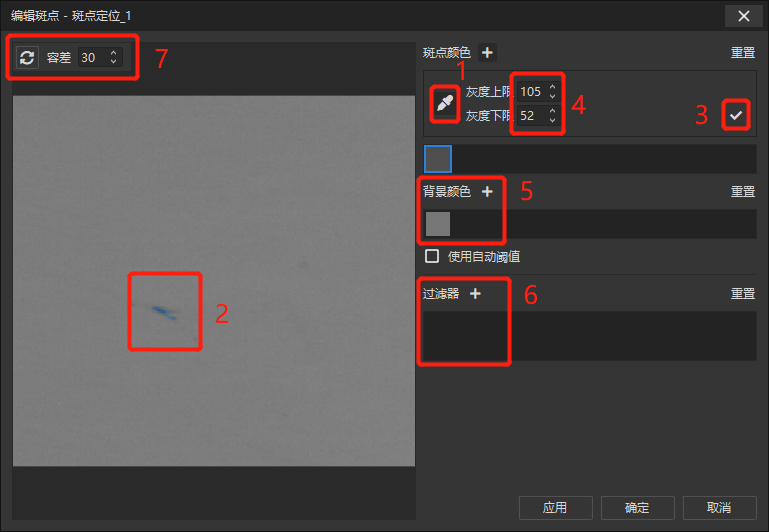 然后在參數(shù)欄打開斑點(diǎn)配置界面,用戶可以按照以下步驟完成斑點(diǎn)提取,順序與圖中的序號(hào)一一對應(yīng):