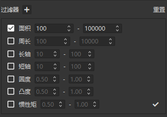 6.斑點(diǎn)過濾器配置如圖4所示,用戶可以通過這個(gè)過濾器過濾不符合標(biāo)準(zhǔn)的斑點(diǎn),可選的參數(shù)有面積、周長等