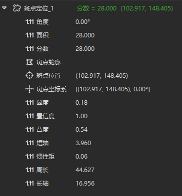 在提取到斑點(diǎn)后,靈閃會(huì)輸出斑點(diǎn)的相關(guān)算法結(jié)果來作為相關(guān)檢測的依據(jù),例如把面積的大小作為缺陷判斷標(biāo)準(zhǔn)的依據(jù),通過斑點(diǎn)位置進(jìn)行缺陷區(qū)域的切割等,具體算法結(jié)果如圖6所示。