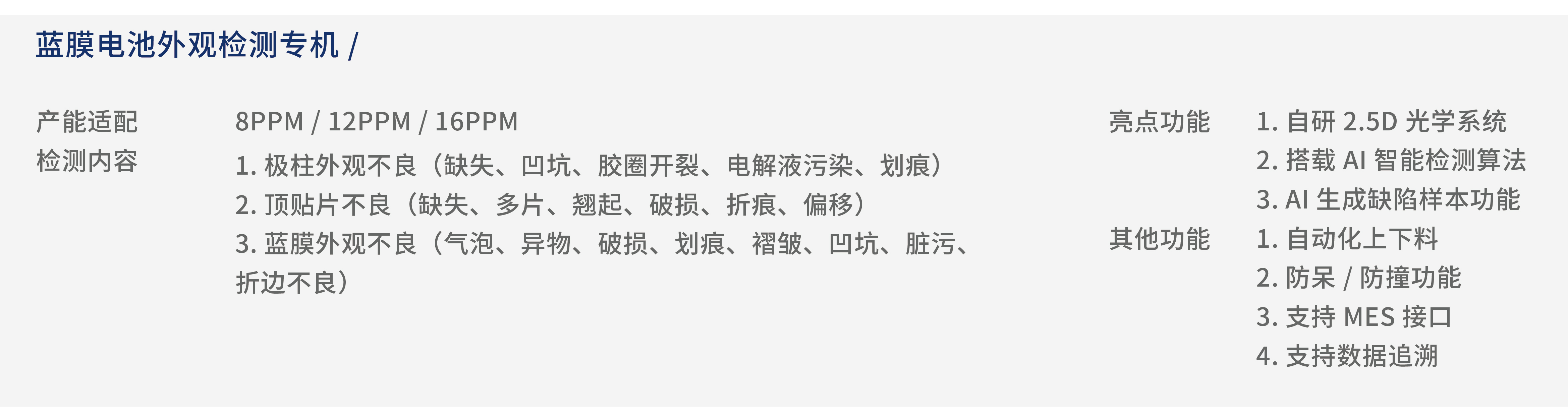 設(shè)備用于藍(lán)膜電池外觀檢測,采用自動上下料和特制輸送機(jī)構(gòu),搭載智能AI算法的自主研發(fā)檢測軟件,實(shí)現(xiàn)電池質(zhì)量的精準(zhǔn)品質(zhì)把控。